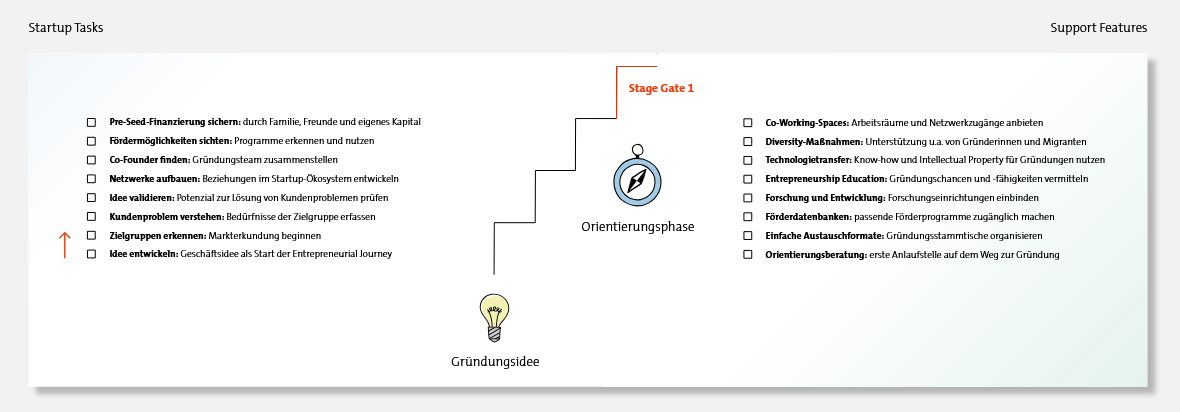 Der Übergang von der Orientierungsphase in die Gründungsphase - also Stage Gate 1 - ist erreicht, wenn eine Lösung für das zentrale Problem klar erkannt ist, erste Kenntnisse über potenzielle Kundinnen und Kunden vorliegen und die Bereitschaft besteht, die formale Gründung anzugehen. In der nächsten Phase geht es darum, diese Grundlagen weiter zu konkretisieren und die Geschäftsidee systematisch in ein tragfähiges Geschäftsmodell zu überführen. Im Online-Beitrag in der nächsten Woche wird die Gründungsphase vertiefend besprochen.