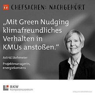 Nachgehört: RKW Zukunftskonferenz 2023 "Abenteuer Mittelstand - Krise als New Normal": Astrid Stehmeier berichtet in ihrem Online-Vortrag von Projektunternehmen, denen das "Anstupsen" zu mehr klimafreundlichem Verhalten gelungen ist.