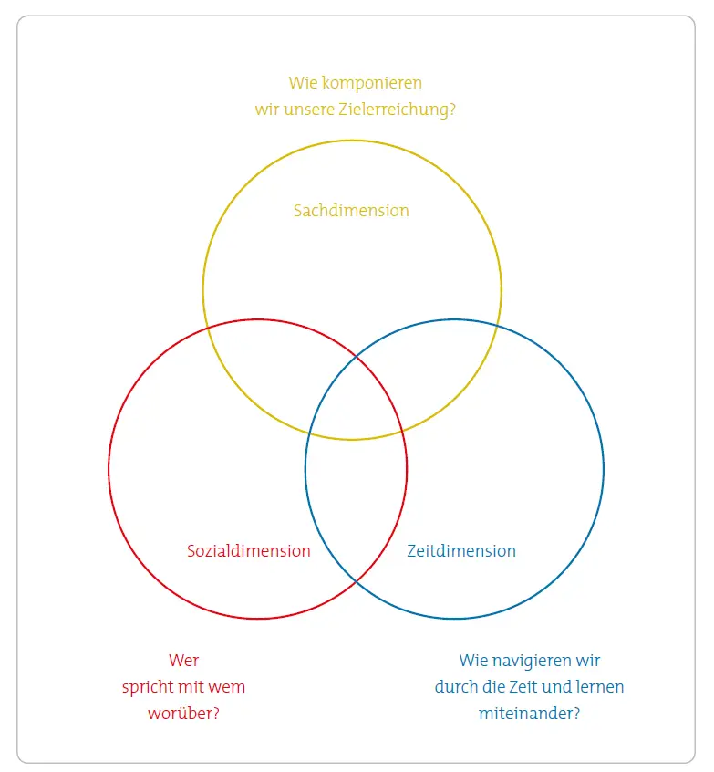 Die Zeitdimension betrifft das Können des Teams – in ihr wird sichergestellt, dass die erforderlichen Ressourcen und der zeitliche Rahmen vorhanden sind, um die inhaltlichen Ziele zu erreichen. In der Zeitdimension wird hinterfragt, ob das Team realistisch in der Lage ist, seine Aufgaben und Ziele zu bewältigen. Es geht um das Timing, die Planung und die Fähigkeit des Teams, sich flexibel an gegebene Zeitrahmen anzupassen. Diese Dimension umfasst auch die Fähigkeit des Teams, aus vergangenen Erfahrungen zu lernen und sich auf zukünftige Anforderungen vorzubereiten. Die Zeitdimension sorgt also dafür, dass das Team seine Ziele nicht nur erreichen will, sondern sie auch tatsächlich erreichen kann. Läuft hier etwas schief, können Aufgaben unerfüllt bleiben, weil das Team zwar motiviert ist und die richtigen Inhalte hat, aber schlichtweg keine ausreichenden Mittel, Zeit oder Kompetenzen zur Verfügung stehen.