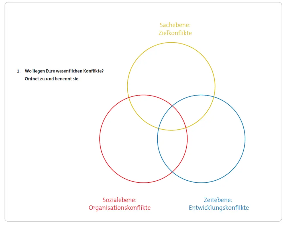 Im Teamradar sind die drei Dimensionen als drei sich überschneidende Kreise dargestellt. Diese Darstellung ist auch die Basis für die Visualisierung der meisten der folgenden Übungen.