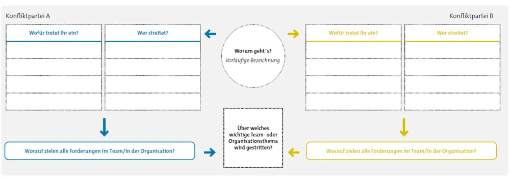 Diese Übung unterstützt das Team dabei, einen Konflikt im Hinblick auf ihre zugrunde liegenden Spannungsverhältnisse zu analysieren. Ziel ist es, Konflikte nicht nur als Hindernisse, sondern als sinnvolle Spannungen innerhalb der Organisation zu betrachten, die möglicherweise auf wichtige strukturelle oder organisatorische Themen hinweisen. Durch diesen Prozess kann das Team wertvolle Einsichten gewinnen, die sowohl das Verständnis als auch die Lösungsansätze für bestehende Konflikte fördern.