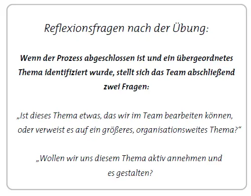 Zum Abschluss wird reflektiert, welche übergeordneten Team- oder Organisationsthemen hinter dem Konflikt stehen. Überlegen Sie gemeinsam, welcher strukturelle oder organisatorische Aspekt mit dem Konflikt verbunden ist. Oft sind mehrere Themen möglich – hier darf das Team dem Bauchgefühl folgen und das Thema wählen, das am besten zum Konflikt passt. Dieses Thema dient als Schlüssel, um das Spannungsverhältnis zu erkennen und zu analysieren.
