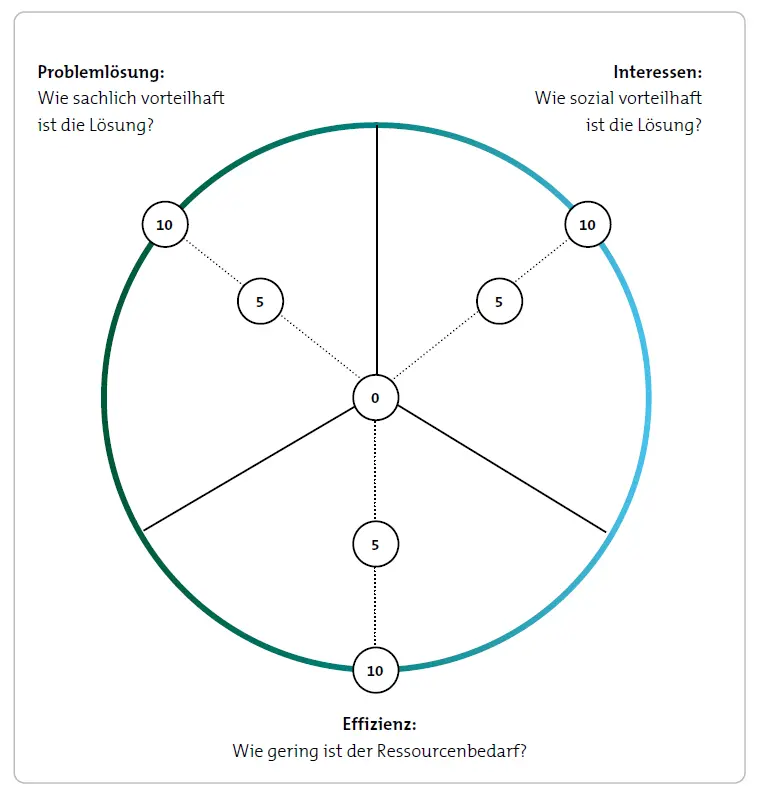 - Vorteile werden am äußeren Rand des Kreises notiert, Nachteile im inneren Bereich, unterscheiden Sie dabei sachliche Vor- und Nachteile (Feld „Problemlösung“) von sozialen (Feld „Interessen“).