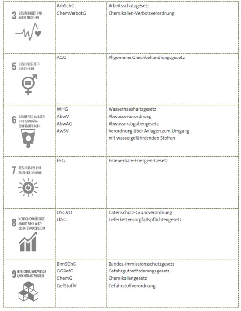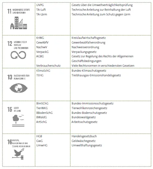 Betrachtet man die für wirtschaftliche Aktivitäten zutreffenden Themen der UN-Nachhaltigkeitsziele, ist zu erkennen, dass viele Aspekte dieser ESG-Themen (ESG = Environmental, Social and Corporate Governance ) schon lange vor ihrer Formulierung auch in unabhängigen Gesetzgebungen adressiert und in der EU mittlerweile größtenteils vereinheitlicht wurden. So unterhalten heutzutage viele KMU zur besseren Übersicht ein Rechtskataster. Zusätzlich stehen in allen behördlichen Betriebsgenehmigungen Anweisungen zu gesetzlichen Richtlinien und einzuhaltenden Grenzwerten, die die Themen Luft-, Lärm-, Wasser-, Boden-, Arbeits-, Gesundheits- und Tierschutz sowie Abfall, Arbeitssicherheit, Finanzberichtswesen und vieles mehr betreffen.