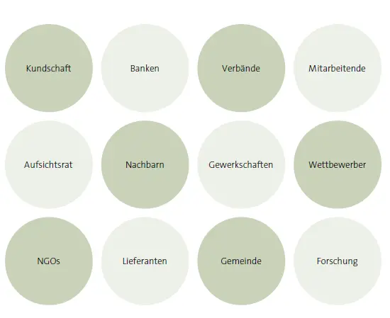 Durch die Ist-, die Umfeld- und die Systemanalyse hat das Unternehmen eine Vielzahl von Auswirkungen ermittelt. Diese Auswirkungen sind aber nur eine Innensicht des Unternehmens. Bevor es in die Bewertung der Auswirkungen geht, sollte der Dialog mit den wichtigsten Stakeholdern (Anspruchsgruppen) gesucht werden. Anspruchsgruppen sind Personen oder Organisationen, die Interesse am Unternehmen haben oder direkt von seinen Auswirkungen betroffen sind.