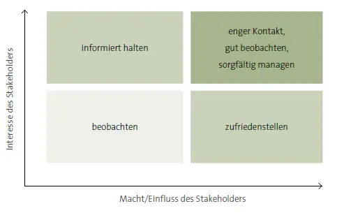 Um festzustellen, welche Anspruchsgruppen für das Unternehmen besonders wichtig sind, werden diese in die sogenannte Stakeholdermatrix eingruppiert: Mit den Stakeholdern, die oben rechts eingruppiert werden, sollte ein Dialog geführt werden. Diese Stakeholder sind für das Unternehmen besonders wichtig und können wichtige Aspekte für die Nachhaltigkeitsstrategie liefern. Die bisher erarbeiteten Auswirkungen sowie Chancen/Risiken werden den Stakeholdern vorgestellt und um Feedback gebeten. Eventuell wird die Liste der Auswirkungen und Chancen/Risiken in dieser Phase weiter ergänzt.