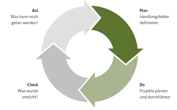 Den Mitarbeitenden und Führungskräften muss die Nachhaltigkeitsstrategie bekannt gemacht werden. Alle Mitarbeitenden können in Ihren Arbeitsbereichen zur Erfüllung der Nachhaltigkeitsstrategie beitragen. Nachhaltigkeit ist ein Marathon und kein Sprint. Nach dem Bericht ist vor dem Bericht. Viele kleine Schritte führen zum Ziel. Ist das Ziel erreicht, gilt es, sich neue Ziele zu setzen. Ganz im Sinne des PDCA-Regelkreislaufs: „Plan – Do – Check – Act“.