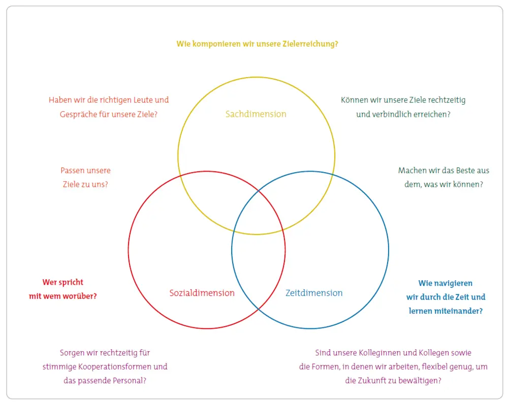 | Frage an die Sachdimension: | Das Miteinander und die sachlichen Ziele müssen aufeinander abgestimmt sein. Es reicht nicht, ambitionierte Ziele zu setzen – sie müssen zu den Menschen und ihren Fähigkeiten passen, um tatsächlich erreicht werden zu können. Die Frage „Passen unsere Ziele zu uns?“ stellt sicher, dass die Ziele des Teams mit den sozialen Strukturen, Ressourcen und Interessenlagen übereinstimmen. Sie überprüft, ob die sachlichen Ziele realistisch im Rahmen der vorhandenen sozialen Kapazitäten erreichbar sind. |