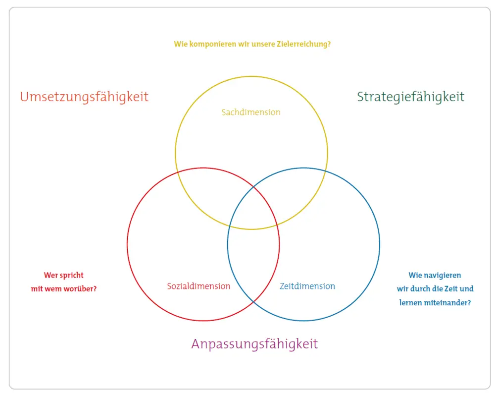 | Frage an die Sozialdimension: | Veränderungsfähigkeit in Organisation und Köpfen ist erforderlich, um auf sich wandelnde Anforderungen zu reagieren und um zu gewährleisten, dass Kommunikationsstrukturen und Teammitglieder auch unter sich ändernden Vorzeichen zu einer effizienten und effektiven Leistungserbringung beitragen. Die Frage „Sind unsere Kolleginnen und Kollegen sowie die Formen, in denen wir arbeiten, flexibel genug, um die Zukunft zu bewältigen?“ bezieht sich auf die notwendige Entwicklung von Lern- und Veränderungsprozessen im Zeitverlauf. Sie stellt sicher, dass die Kommunikation im Team flexibel und anpassungsfähig bleibt, sodass die richtigen Menschen zur richtigen Zeit über die relevanten Themen sprechen. |