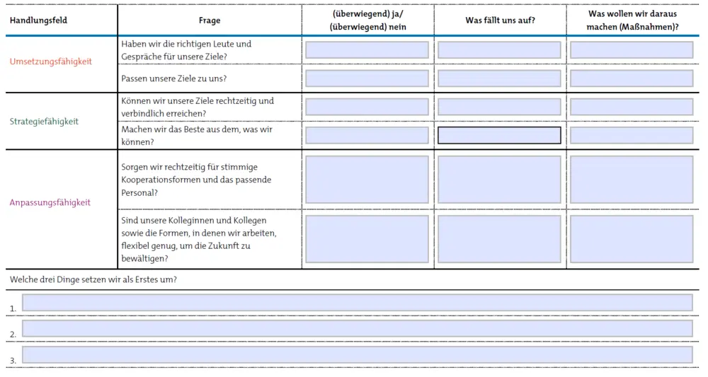 - Frage an die Sozialdimension: „Sind unsere Kolleginnen und Kollegen sowie die Formen, in denen wir arbeiten, flexibel genug, um die Zukunft zu bewältigen?“