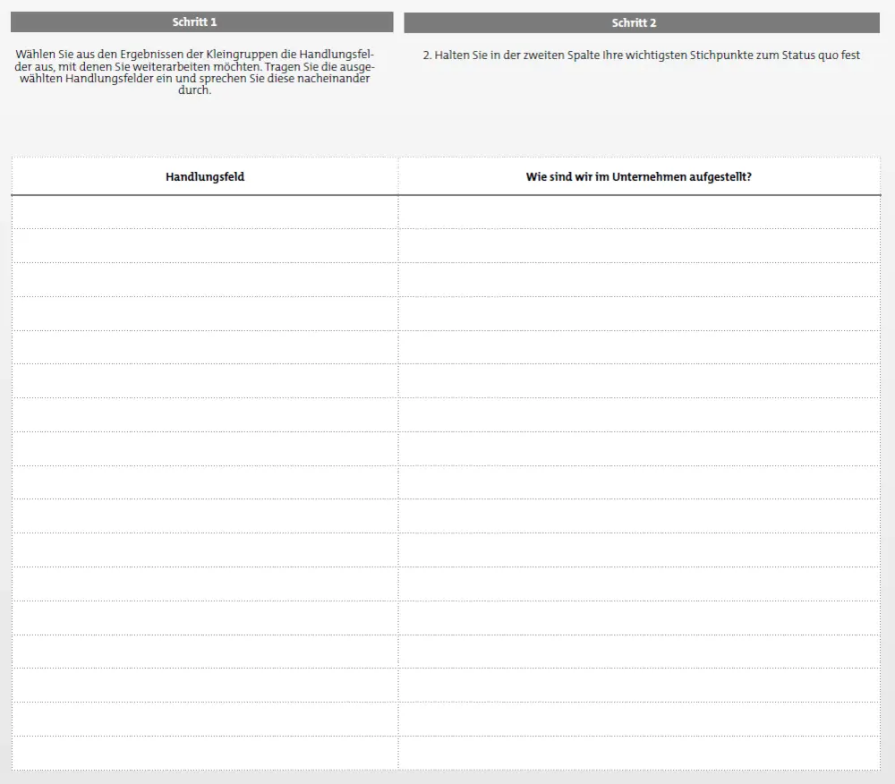 Nach der Arbeitsphase der Kleingruppen kommen alle Teilnehmenden im Plenum zusammen. Nun geht es um eine gemeinsame Vorstellung und Würdigung der Ideen: Die Sprecherin oder der Sprecher jeder Kleingruppe präsentiert das Ergebnis für das jeweilige Themenfeld. Sprechen Sie jedes Handlungsfeld durch.