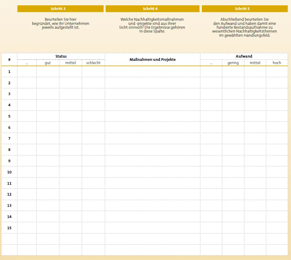 Die strukturierte Wesentlichkeitsanalyse findet in Form von Kleingruppenarbeiten und mithilfe des entsprechenden Arbeitsblatts (Beileger zum Moderationsplakat Schritt 3 „Wesentlichkeitsanalyse“) statt. Falls die Gesamtgruppe weniger als sechs Teilnehmende umfasst, können Sie diese Abschnitte auch gemeinsam im Plenum bearbeiten. In diesem Fall entfällt das spätere Zusammentragen der Kleingruppenergebnisse. Orientieren Sie sich bei Ihrer Arbeit an der folgenden Grafik.